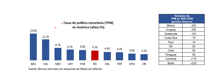 El Banco Central de la República Dominicana (BCRD), en su reunión de política monetaria de abril de 2026, decidió mantener su tasa de interés de política monetaria (TPM) en 5.25% anual. Asimismo, la tasa de la facilidad permanente de expansión de liquidez (Repos a 1 día) permanece en 5.75% anual, mientras la tasa de depósitos remunerados (Overnight) continúa en 4.50% anual.