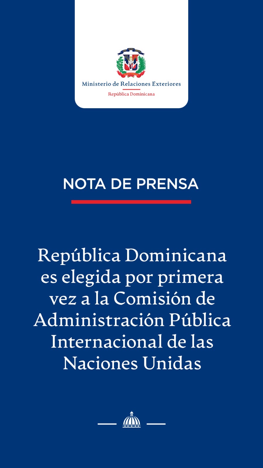 Santo Domingo de Guzmán, República Dominicana. – El Ministerio de Relaciones Exteriores (MIREX) informó que por primera vez República Dominicana fue elegidamiembro de la Comisión de Administración Pública Internacional (CAPI) de la Organización de las Naciones Unidas (ONU). El MIREX detalló a través de una nota de prensa, que la representación del país estará a cargo del embajador dominicano en Canadá y exrepresentante permanente ante la ONU, José Blanco Conde, lo que marca como un nuevo hito del liderazgo del país dentro del sistema multilateral, basado en el diálogo, la cooperación y la promoción de los valores democráticos e institucionales. A través de este organismo, República Dominicana tendráuna participación en la toma de decisiones de las políticas de gestión de recursos humanos aplicables al personal del sistema común de las Naciones Unidas, entre otros temas relacionados a la CAPI. Con esta designación, República Dominicana reafirma su compromiso con el fortalecimiento de la gobernanza global y la promoción de una administración pública internacional más justa, eficiente y profesional. Sobre CAPI La CAPI, establecida por la Asamblea General de las Naciones Unidas en 1974, es un órgano independiente de expertos, encargado de establecer normas, políticas y estándares que garanticen la eficiencia, equidad y profesionalismo en la función pública internacional. Está compuesto por quince miembros que actúan a título personal, designados por períodos de cuatro años garantizando una representación geográfica equitativa y una gestión moderna, inclusiva y transparente del servicio civil internacional.