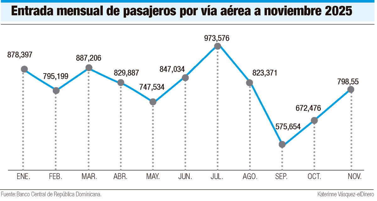 De acuerdo con datos estadísticos del Banco Central de República Dominicana (BCRD), julio se posicionó como el mes de mayor dinamismo al registrar 973,576 viajeros. Le siguieron marzo con 887,206, enero con 878,397, junio con 847,034, abril con 829,887 y agosto con 823,371.