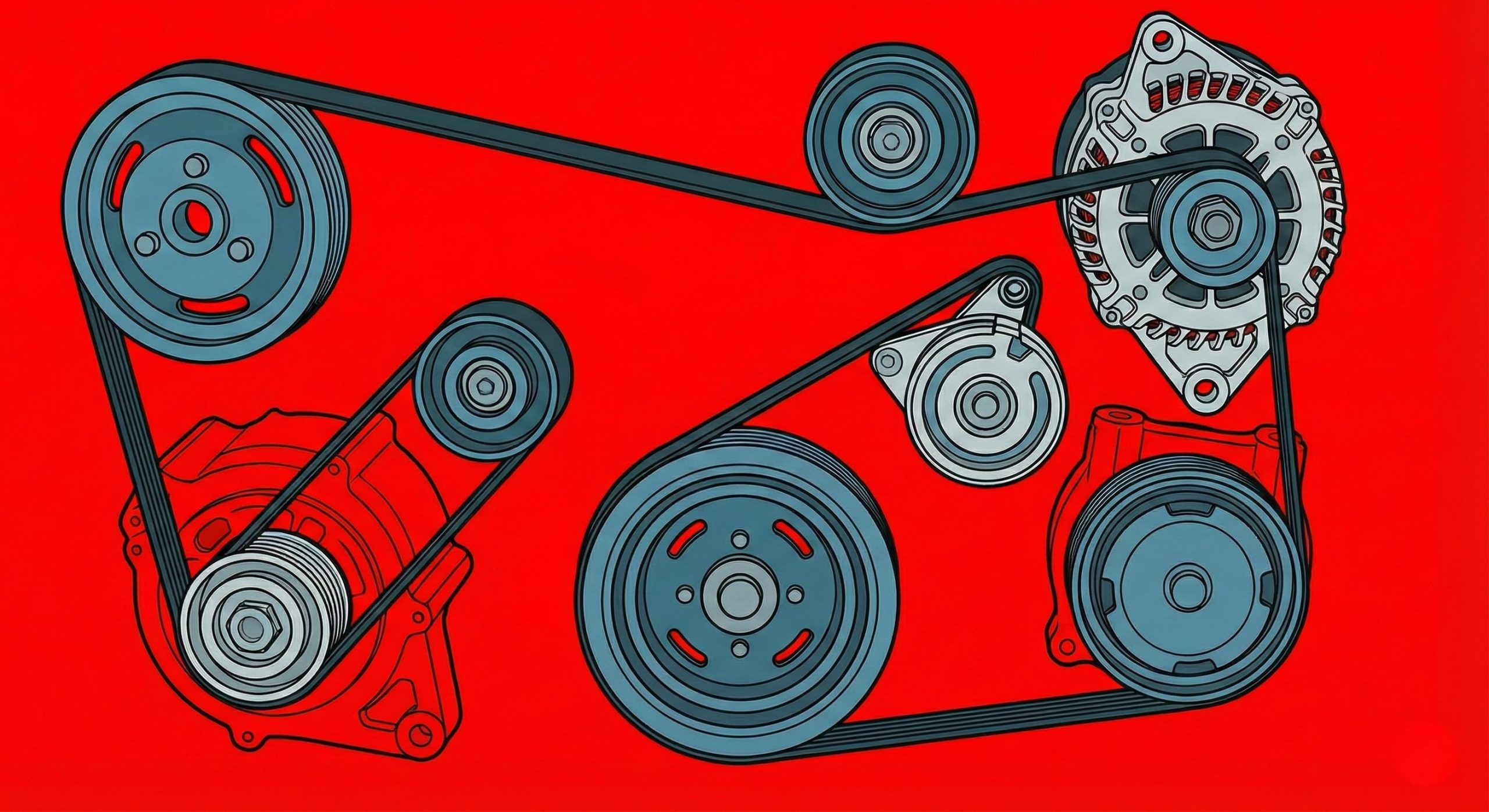 Pensemos en cómo funciona una banda de serpentina (serpentine belt). Su trabajo es transmitir potencia del cigüeñal (crankshaft) a componentes vitales como el alternador, la bomba de agua y el compresor del aire acondicionado (AC compressor).