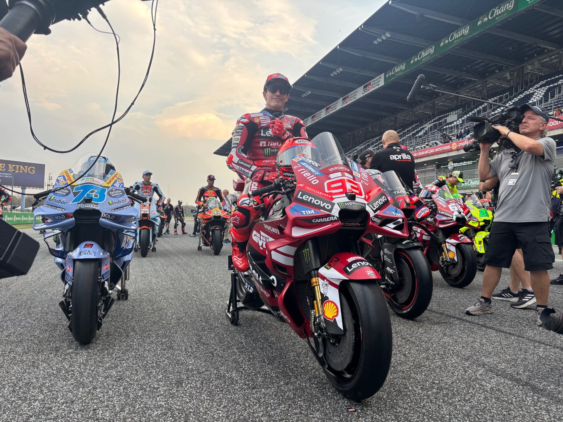 Atraco de AS a Marc Márquez, el de cada año, tras la foto de familia en la recta de meta del circuito Chang Internacional de Buriram, en Tailandia. Nueve títulos mundiales contemplan al del Ducati Lenovo ya y sale a por el décimo que no logró Rossi, algo para lo que espera no pasen de nuevo 2.184 días como la vez anterior. Ese es el tiempo que transcurrió entre su coronación en 2019 y la de 2025. Seis años han hecho falta, por tanto, para verle de nuevo al frente de la foto de familia de la clase reina, esta vez con una ausencia. El año pasado la moto sin dueño era la de Jorge Martín y esta vez ha sido la de Fermín Aldeguer, con un simpático Márquez en cabeza por méritos propios…