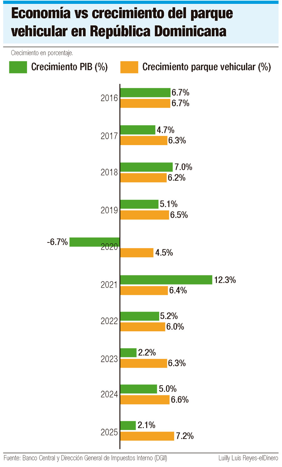 El aumento de esta cantidad no ha sido un fenómeno reciente. Durante la última década, el parque vehicular dominicano ha crecido con tasas que en promedio rondan el 6% anual, un ritmo relativamente similar al crecimiento económico que el país registra anualmente, que en la última década generalmente estuvo situado entre 4% y 5% anual. Sin embargo, lo que parecía ser la norma, dejo de serlo en 2025.