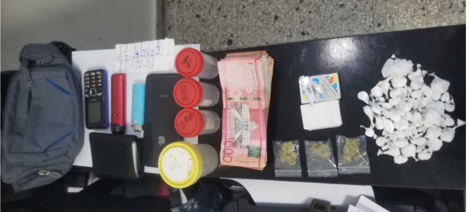 Asimismo, fueron ocupados papeles para la preparación de sustancias, una balanza, un envase con líquido desconocido, siete (07) cajetillas de cigarrillos y la suma de veintitrés mil quinientos quince pesos dominicanos (RD$23,515.00) en efectivo.