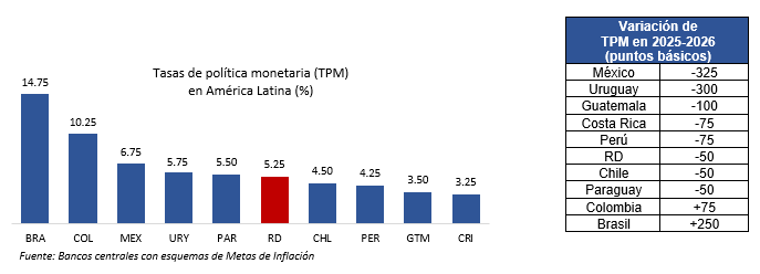 El Banco Central de la República Dominicana (BCRD), en su reunión de política monetaria de marzo de 2026, decidió mantener su tasa de interés de política monetaria (TPM) en 5.25% anual. Asimismo, la tasa de la facilidad permanente de expansión de liquidez (Repos a 1 día) permanece en 5.75% anual, mientras la tasa de depósitos remunerados (Overnight) continúa en 4.50% anual.