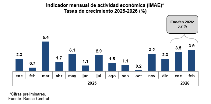 Las cifras preliminares del indicador mensual de actividad económica (IMAE) del mes de febrero de 2026 reflejaron un incremento interanual de 3.9%, el ritmo de expansión de la actividad económica más alto de los últimos once meses. Con este resultado, se acumula un crecimiento promedio de 3.7% para los primeros dos meses del presente año.